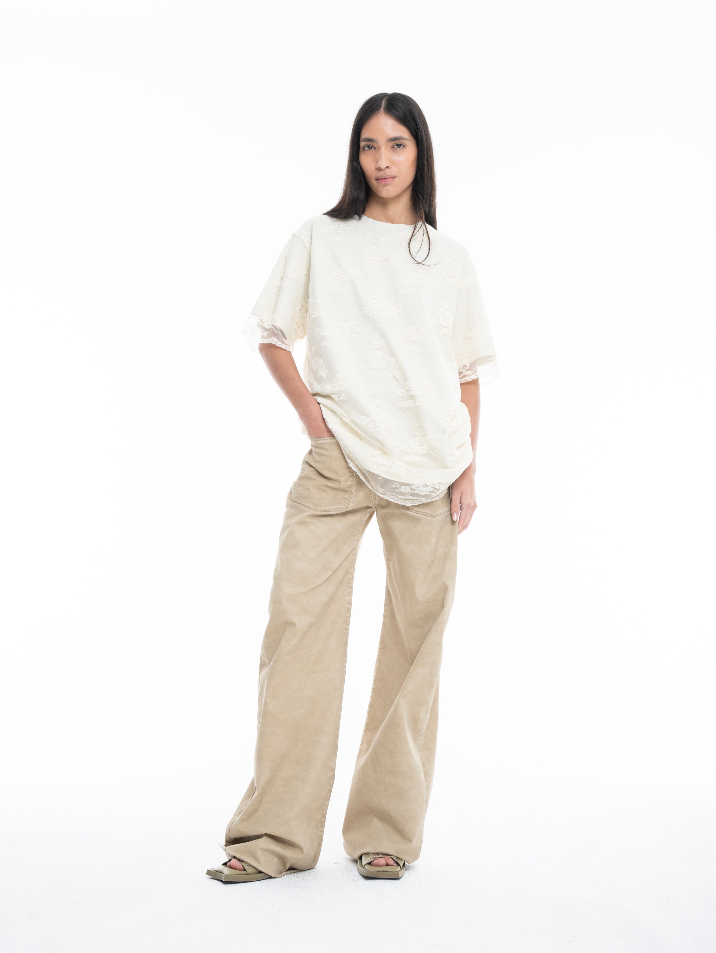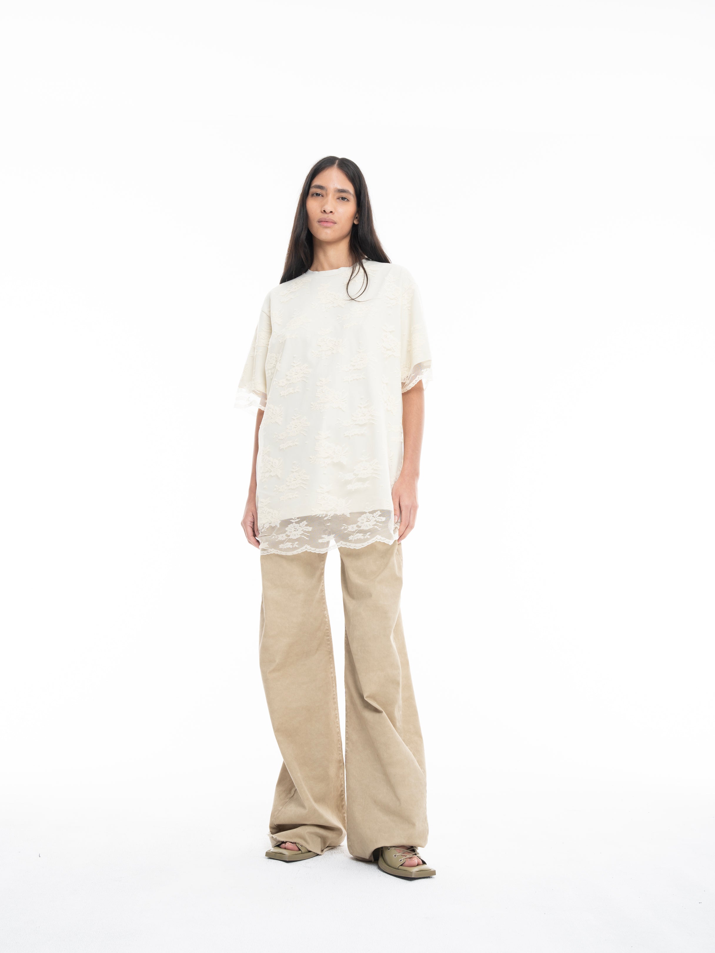 OFF-WHITE RELAXED FIT T-SHIRT WITH LACE OVERLAYER